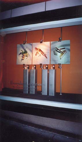 | Hand Crafted & Designed Aluminum Pedestals (With Internal Lighting to Illuminate Fragrance Bottle) for Wilkes Bashford's Fragrance Launch. (Saks Fifth Avenue San Francisco Store Windows Shown) In Addition All Stores Nationwide Were Featured |